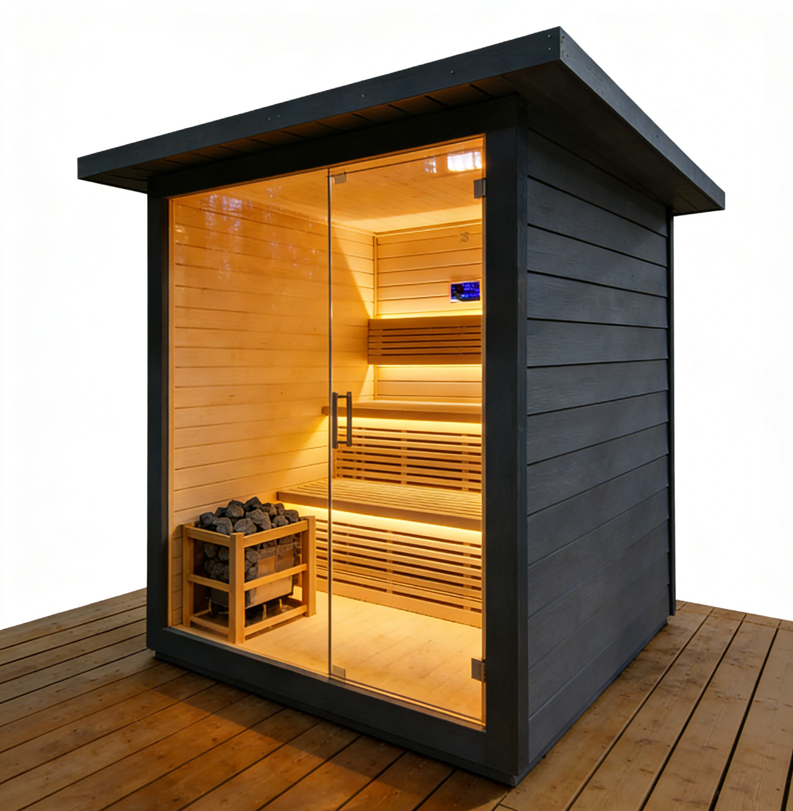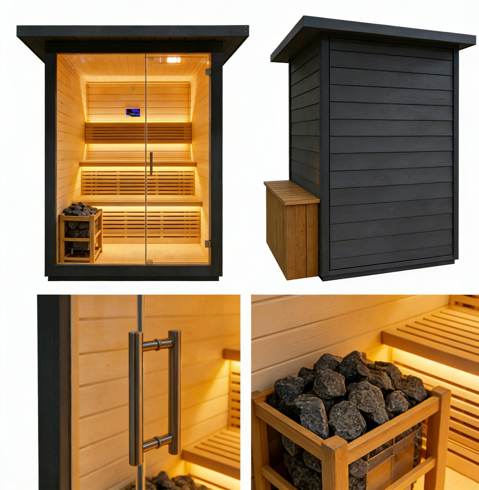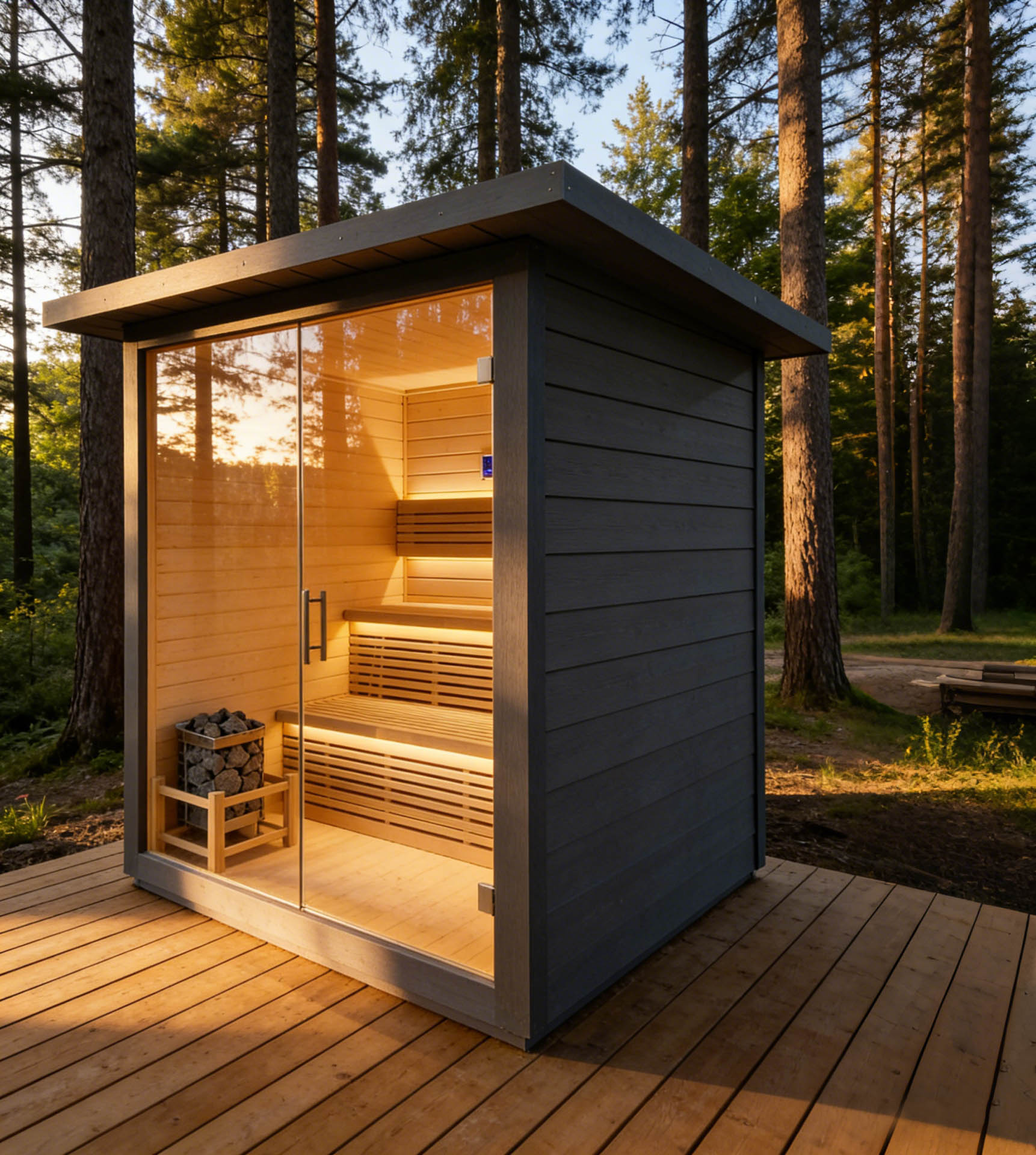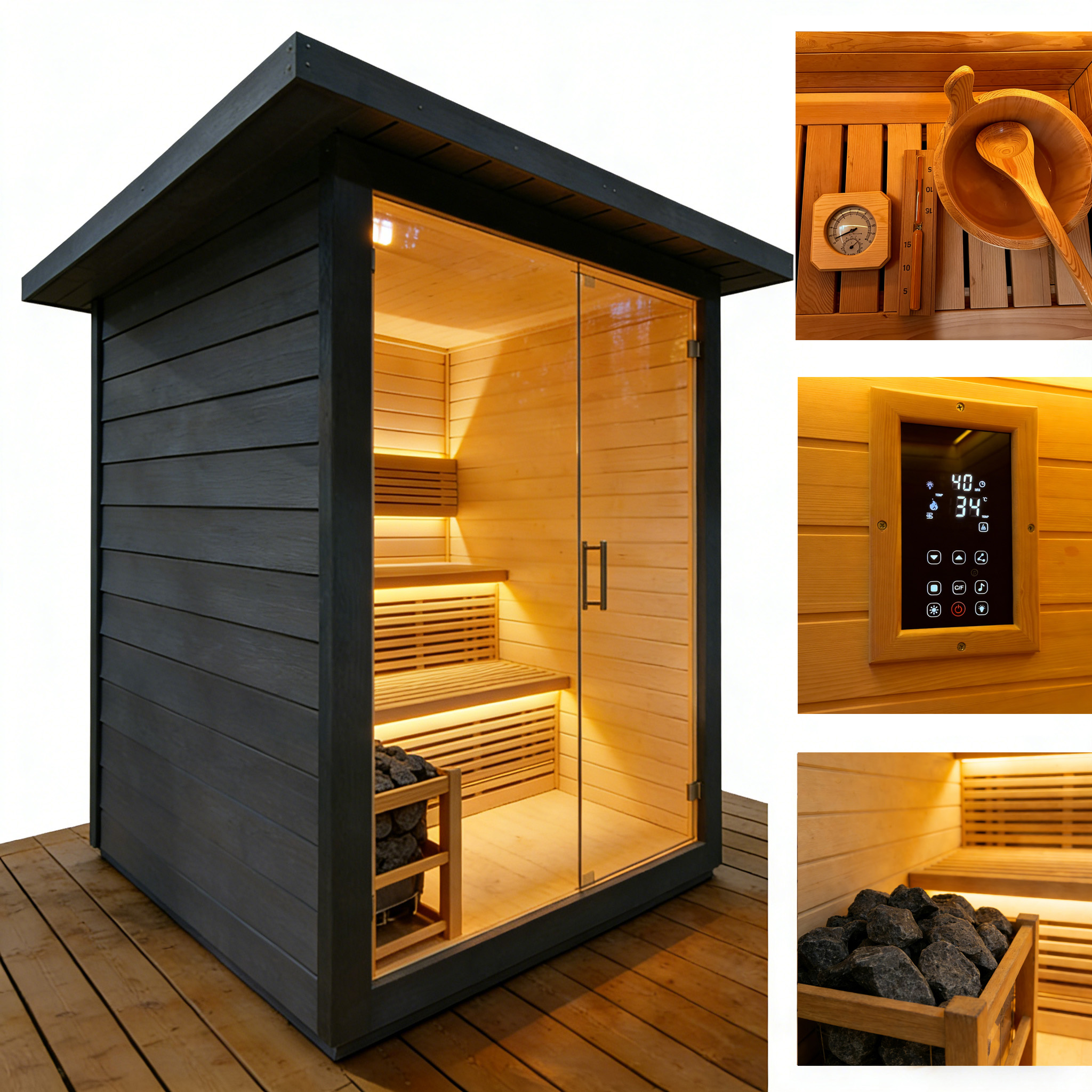 Outdoor thermally modified wood sauna room, crafted from selected high-quality thermally modified wood, which is corrosion-resistant and crack-resistant, suitable for outdoor environments. With a closed constant temperature design, it heats up quickly and locks in heat, allowing you to enjoy a comfortable sauna bath. Its simple design blends into the courtyard scenery, and the safe and environmentally friendly materials create a natural and pleasant outdoor relaxation space for you.